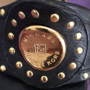 Micheal Kors size 10 black leather with gold studs wicker platform wedge heel
