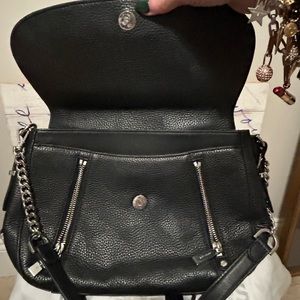 Michael kors Black Pebble Leather versatile handbag with Crossbody Strap. Has silver chain across. Lots of pockets. 2 zippers in front w/different slots. Buckles trendy on both sides. Both Straps Detach. Super clean. A few spots on inside. Smoke free home. Bought a The Mk Store. Questions ask please.