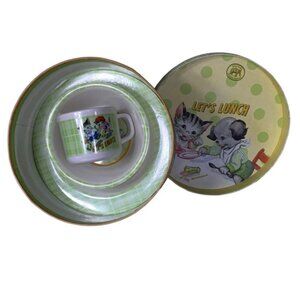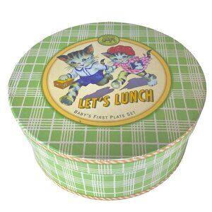 The set is brand new and sealed, ready to gift or to be used by your little one. The retro plaid storage box and green color adds a cheerful touch to mealtime