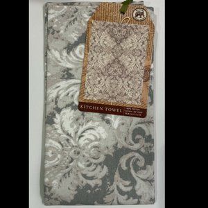 Michel Design Works Kitchen Towel Earl Grey Damask Pattern 20" x 28" 100% Cotton. Has convenient hanging loop and is machine washable.