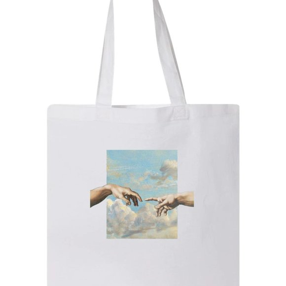 Michelangelo Creation of Adam Sistine Hand Painting Art Tote Bag - Reusable, lightweight go-everywhere bag keeps you ready to shop responsibly - Bag measures 15” x 16” with 20” Handles - Lightweight 8oz 100% Polyester Canvas Tote Bag - Custom-printed, One-sided design