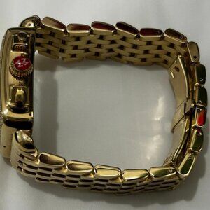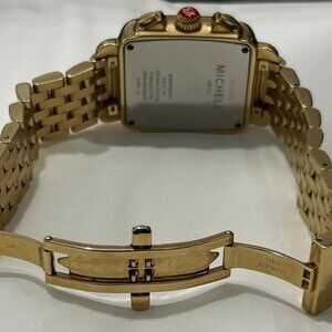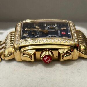 Elevate your style with this luxurious Michele Deco wristwatch. Featuring a stunning diamond bezel, this chronograph watch boasts a Swiss/Quartz movement and water resistance up to 50 meters. The gold and orange 18K plated stainless steel bracelet complements the blue dial, making this watch a perfect accessory for any occasion. With its screwback case and original box/packaging, this MICHELE Deco model is a must-have for any watch lover. The rectangle watch face measures 33mm x 35mm and features a diamond bezel, adding a touch of elegance to this already luxurious timepiece. Don't miss out on the chance to own this beautiful watch.