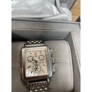 The Michele Deco Chronograph watch combines style and functionality. Featuring a stainless steel bracelet and a sophisticated square face, it offers precise timekeeping with its chronograph feature. Perfect for those who appreciate fine craftsmanship and timeless elegance, this watch is a standout accessory for both formal and casual occasions. In very good condition with no defects noted. SKU 9190