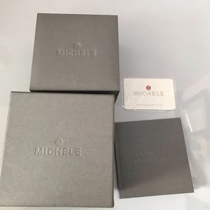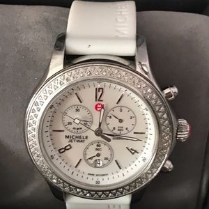 Authentic Michele Jetway Diamond Bezel Watch. mother of pearl dial. Chronograph with 3 sub dials. Stainless steel case. Quartz movement. Scratch resistant crystal. Sport watch style. MW17A01A1025. Original box, pillow, polishing cloth and manual. Michele white silicone rubber band. Needs battery. Excellent condition. 39 mm case size