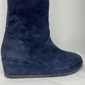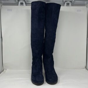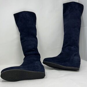 This is a beautiful pair Michele Negri Sz 8.5 Blue Suede Low Wedge Whipstitch Trim Knee Boots. Worn just a couple of times. Excellent condition. Non slip rubber sole. Fully leather lined. Very soft. Can be folded for various lengths. Full height: 22”