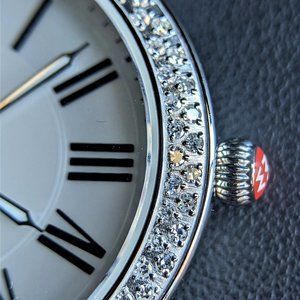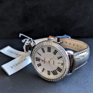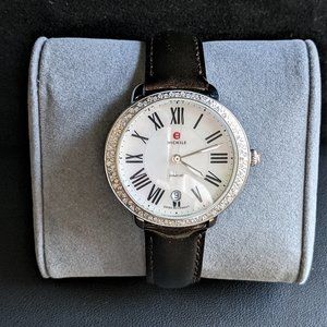 Elegant Michele "Serein" watch with 88 hand-set diamonds on the bezel weighing 0.50 carats total weight. Mother of pearl dial with black roman numerals and date at 6 o'clock position on espresso brown leather strap. The 16mm watch strap is interchangeable with any 16mm Michele strap.