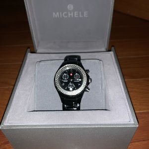 Michele Tahitian Ceramic Watch. Crystal is in perfect condition and is embezzled with 100 diamonds that sparkle. Black ceramic band fits wrist size up to 6.5 inches. No extra links are available, however extra links may be obtained via the Michele site. Will come in The original Michele box with the Michele Mini pamphlet.
