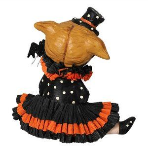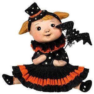 Michelle Allen, of Raggedy Pants Designs, creates handmade collectibles with lots of character & personality! The reproductions are hand painted and embellished with printed papers, tinsel, glitter & other accessories to give them that finishing touch. This adorable figurine would be a wonderful addition to your Halloween collection. Hand-painted resin, crepe paper, wire, tinsel, and glitter.
