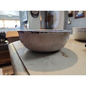 Unique hand-thrown stoneware pottery bowl, signed by Michelle Bennis and inscribed “Sunday Bowl – Hood College, Frederick, MD.” A beautiful studio pottery piece with rustic character and handmade charm, featuring a speckled stone glaze and a rich dark blue rim.