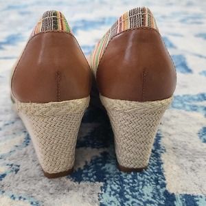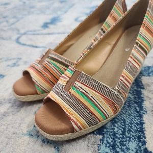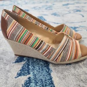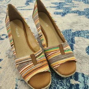 Stylish wedges with multicolor stripes. Features a comfortable wedge heel. Perfect for casual outings.