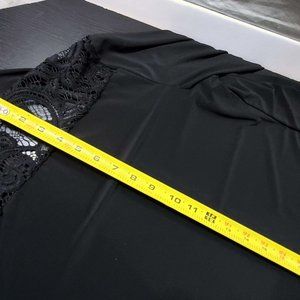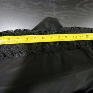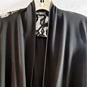 This short black shrug / bolero does not have the size tags so take a look at the photos to see the measurements. It is small for sure but may even be extra small, but it is loose and flowy. The back has a cute sheer lace inset across the shoulders and the sleeves are below the elbow. The brand is Michelle Lynn. Fabric type is unknown.