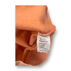 Color is more pink/peach than pictures display. The collar of the pullover gives the most accurate color depiction.
