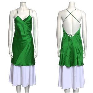 Bias-cut wrap mini dress with thin spaghetti straps in pure silk satin. Features a low scoop back and is fully lined. Made in USA.