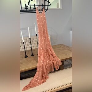 Step out in style with this elegant polka dot ruffle dress. Perfect for any occasion, this dress features a flattering silhouette and a chic design. The soft pink hue adds a touch of femininity to your wardrobe.