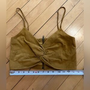 Size 0 suede leather tan zip up bandeau bralette crop top from Michelle Mason. Twist front and thin straps. The stitching on the straps is secure but looks hand stitched. Perfect edgy top for going out or a country western concert vibe.
