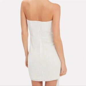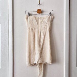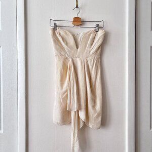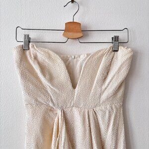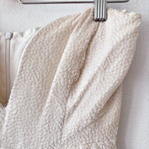 Stunning Michelle Mason off-white velvet strapless mini dress. Deep plunge sweetheart neckline. Asymmetrical hem. Textured velvet material.