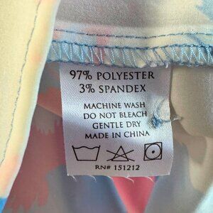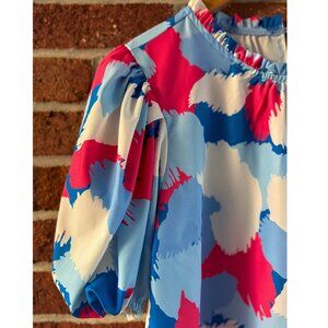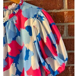 Beautiful Michelle McDowell women’s blouse featuring a bold abstract print in vibrant shades of blue, pink, and white. Designed with puff sleeves, a subtle ruffled neckline, and a lightweight stretch fabric for comfort and movement.