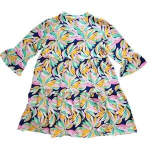Michelle McDowell Morgan tiered seing dress in 'Going Bananas' pattern. Size medium, excellent pre-owned condition. Features a mix of pink, green, and orange colors on a barely-there dark blue background.