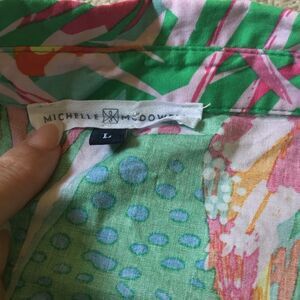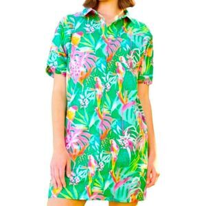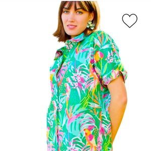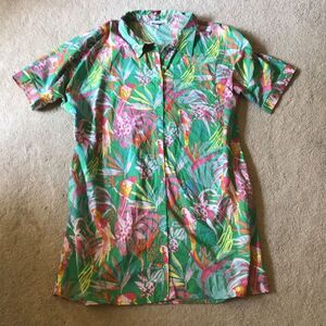 Embrace vibrant style with this tropical green floral shirt dress. Perfect for sunny days, this dress features a lively mix of colors and a comfortable fit.