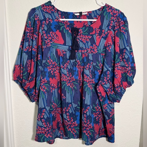 Michelle Mcdowell Floral Abstract Pink Blue Tie Neck Short Sleeve Blouse Size M