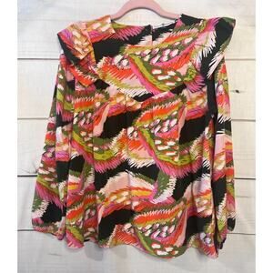 The Michelle Mcdowell top is a colorful long sleeve blouse in size medium, perfect for casual occasions. Made of polyester, this pullover top features ruffle accents and a regular fit. With a multicolor design suitable for summer, fall, and spring seasons, this blouse from the brand Michelle Mcdowell is a stylish and comfortable addition to any woman's wardrobe. Easy to care for with machine washable instructions, this top is a versatile and eye-catching piece for everyday wear.