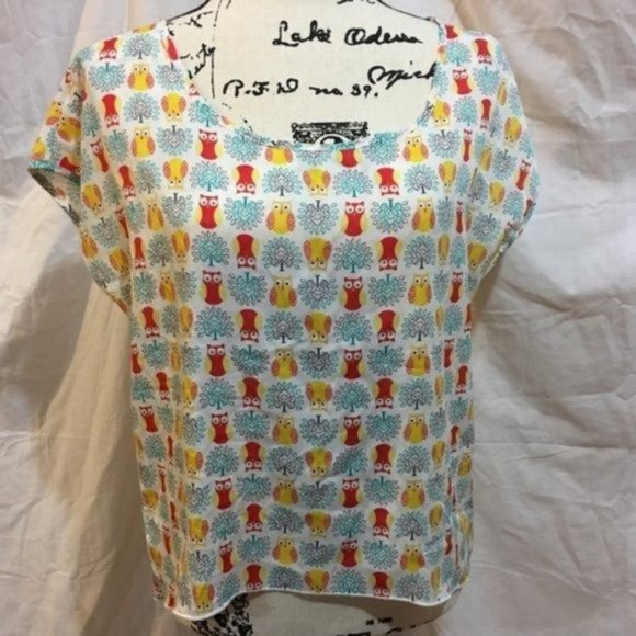 Michelle Owl Pattern Top with cut out back area, size/fabric tag is faded and cannot be read.
