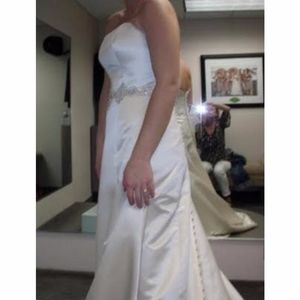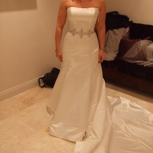 This listing is for a lovely Michelle Roth "Mariah" Trumpet style wedding dress, in ivory. Size 12, but has been altered slightly. Has gorgeous crystal jewel "belt" at empire waist and crystal bead buttons all the way down the sleek back and train. Train can be cinched. and front is now slightly sweetheart shaped. Has been worn once, but has been professionally cleaned and stored in box by dry cleaners. Comes from a smoke and pet-free home.