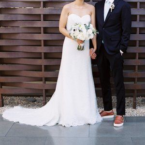 The dress was worn once and has been professionally dry cleaned however the bottom of the dress still shows some slight wear. The zipper clasp was slightly damaged when I purchased the dress. I did not want to spend additional money on alterations to replace the entire zipper so I left it as is. The zipper is fully functional, just the small clasp is semi broken. It is hardly noticeable because the top hook closure and buttons cover the zipper. It is truly a classic and beautiful wedding dress!