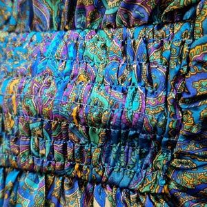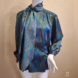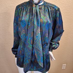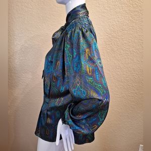 Super Pretty reminds me of a peacock!! Pop-Over,silky fabric, keyhole, and one button back closure. button cuffs, a large band of elastic gathers on shoulders, pleated ever so perfectly. Separate matching Scarf to be worn however you choose Size 4 Measures: 21" arm pit to arm pit. 17" shoulder to shoulder. 24½" shoulder seam to cuff and 26" neck seam to bottom. T-E-3 hem.#michellestuart.
