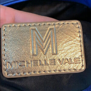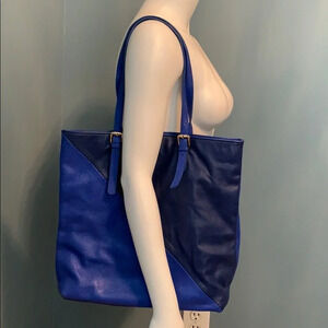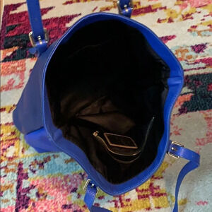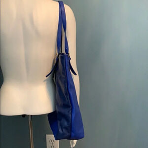 Blue & navy diagonal leather bag. Thin adjustable shoulder straps. Inner zip pocket two cell phone open pockets. Clean liner.