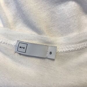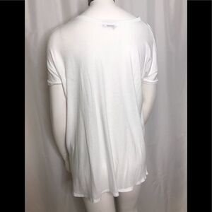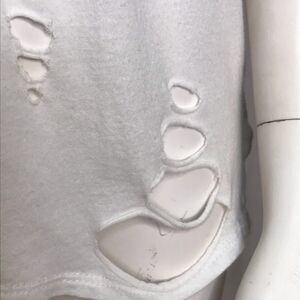 White cotton blend capped sleeve tee shirt with rips in the shoulder and at the bottom. It has a high/low hemline
