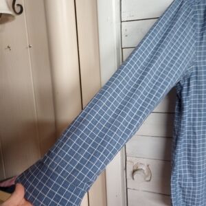 Michelsons London Men's Medium Blue with Purple Flip Cuff Casual Button Down Shirt. Approximate measurements are laying flat armpit to armpit 22" and length from shoulder to hem 30". Condition is pre owned, used, good condition.