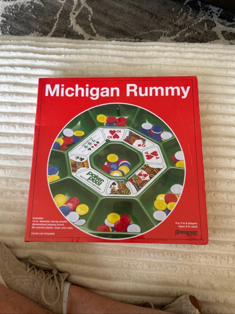 Michigan Rummy board game in vibrant red. Features a green play tray with multi-colored chips for dynamic gameplay. Fun for family and friends, easy to learn and engaging for groups.