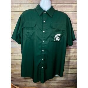 Official Michigan State Spartans fishing-style shirt in men’s size Large. Lightweight short sleeve button-up with utility pockets and embroidered team branding. Ideal for college sports bundles, outdoor drops, or Spartan fan pivots.