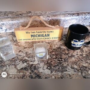 Michigan Wolverines mug, mini football, and card set. Perfect for fans. fan man cave decor University of Michigan