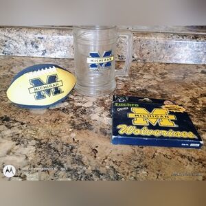 Michigan Wolverines mug, mini football, and card set. Perfect for fans. fan man cave decor University of Michigan