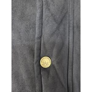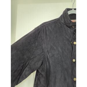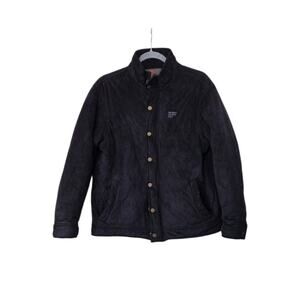 Style: Rare fleece jacket in classic black. Soft fleece outer and fully lined with satin. Insulated and warm. Faded material tag that is unreadable. Zip and snap (logo on snaps) front closure. Mock collar. Long sleeves with snaps at wrists. Front hip pockets and an inner breast pocket on one side. Logo printed on chest on one side. Heavyweight for cold weather. No stretch. Unique piece.