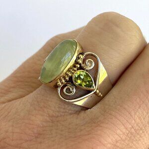 Michou Jewelry Sterling Silver 925 Gold Vermeil Oval Bezel Set Prehnite & Teardrop Peridot Scrollwork Ring
