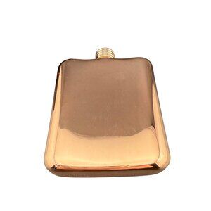 This Michter's 6 oz copper-plated stainless steel flask features a sleek curved shape with rounded edges, engraved branding, and durable construction. Not dishwasher safe.