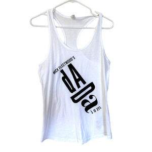 Mick Fleetwood Tribute Dadaism Tank Top in white ft. black Dada graphic, racerback tank top, scoop neckline