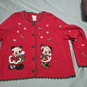 Bright red cardigan featuring Mickey and Minnie Mouse. Ideal for festive occasions,in excellent condition.