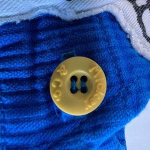 Mickey & CO Made in Guatemala. by J.G.Hook blue corduroy overalls. Toddler size 4T. Huey and Louie Patch on front bib. Only one size on shoulder straps, no other holes to adjust length. Two front pockets. Patch on back. Yellow buttons at waist are all intact. Small area on front left leg that is discolored.