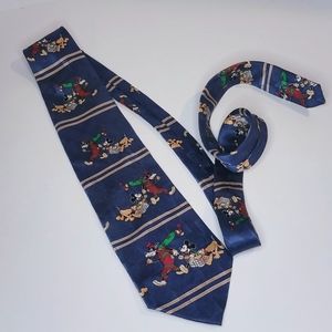 Gently worn. Good condition. Christmas holiday tie. Mickey & Company is a brand. Features Mickey Mouse, Pluto, Goofy, Christmas tree. Blue background.