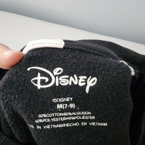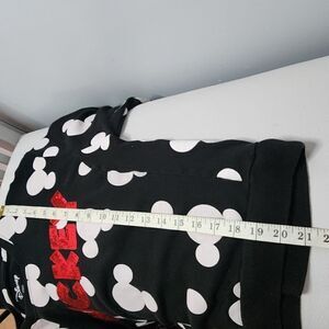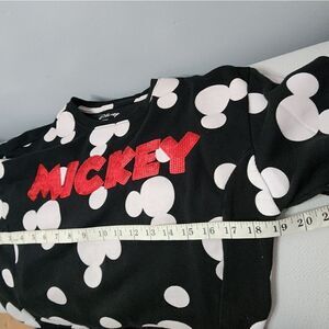 This Mickey Mouse pullover sweatshirt in black and white is perfect for any Disney fan. The red sequin letters add a pop of color to the design. The sweatshirt is a size M and suitable for girls aged 7-9, featuring the beloved character in a contemporary style. The item is a collectible piece of Disneyana, ideal for any adult fan of the franchise. The sweatshirt is in good condition and has not been modified.