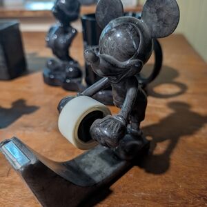 Stylish Mickey Mouse desk accessory set in black and gray. Includes a mug, tape dispenser, stapler, and pen holder.