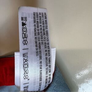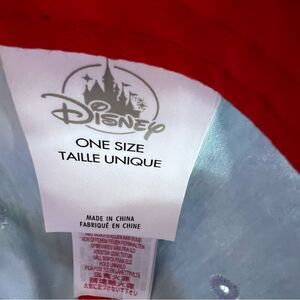 Chambray baseball cap by Disney features red Mickey Mouse silhouette. Red details on light blue chambray background.