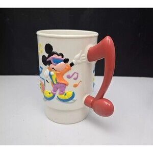 This collectible mug features a fun, raised three dimensional Mickey Mouse theme/design of Mickey in sunglasses rocking out to music playing from his boom box. Colorful musical notes decorate the mug and a giant size note forms the mug handle. Likely from the 1980s, this mug is perfect for reliving nostalgic memories of Disney's World On Ice shows and is a great find for any Disney fan or collector!