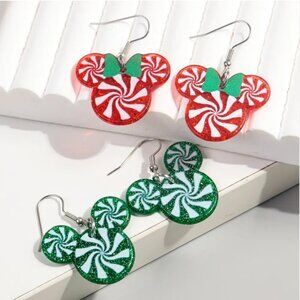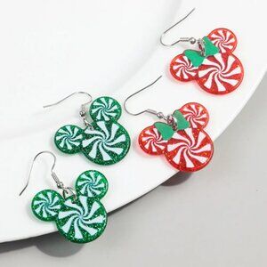 Mickey Mouse Green Swirl Peppermint Dangle Drop Earrings Christmas Festive Holiday Xmas NEW