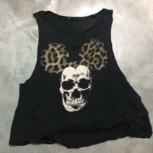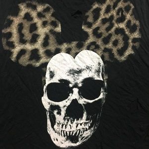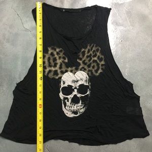 Black Tank Top with a skull wearing leopard Mickey Mouse ears. No sizing on it, but fits anywhere from XS-M. Shirt is cut up/has holes throughout shirt to give it a distressed look. Shirt is soft and somewhat sheer. Perfect for disney fan. Only worn a handful of times