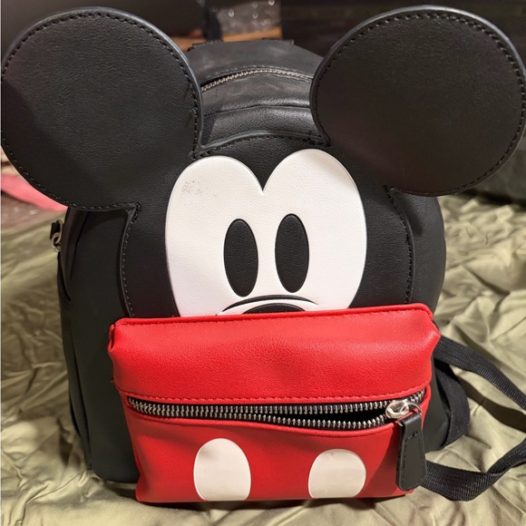 Cute Mickey Mouse mini backpack featuring a red pouch with zipper. Perfect for Disney fans.
